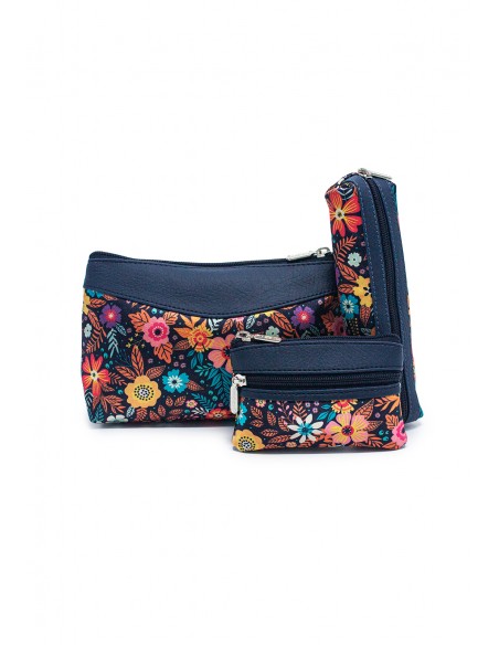Juego de cosmetiquera, monedero y portaesferos MACOLY, elaborado en sintético, diseño casual con textura grabada. Detalles alusivos a la marca y finas costuras visibles.