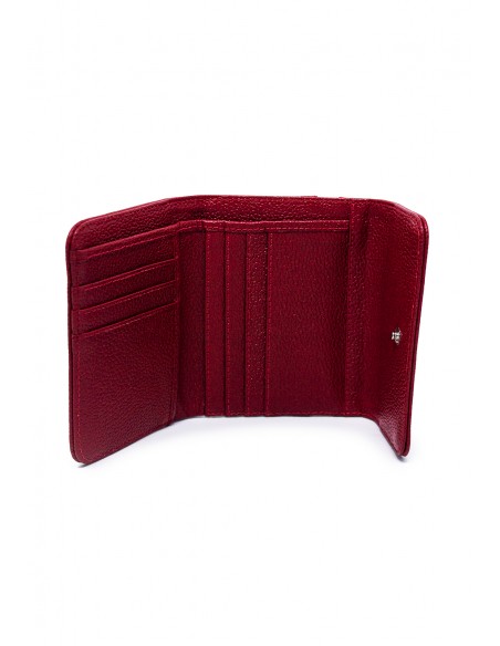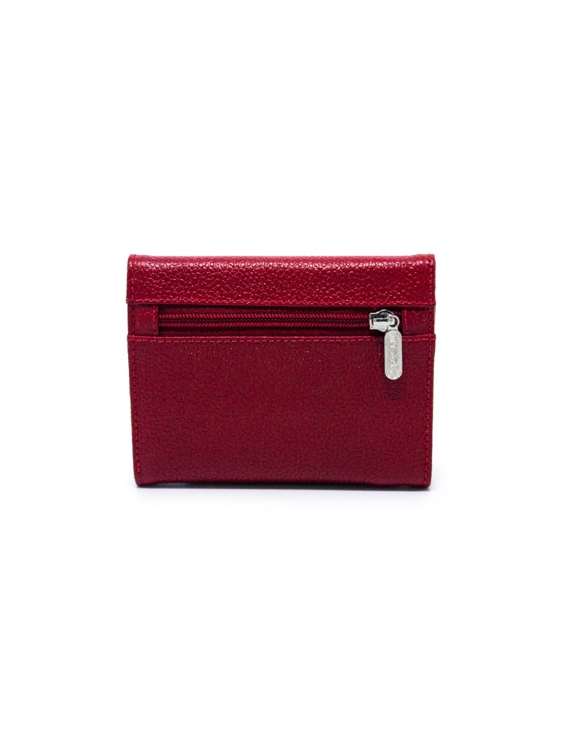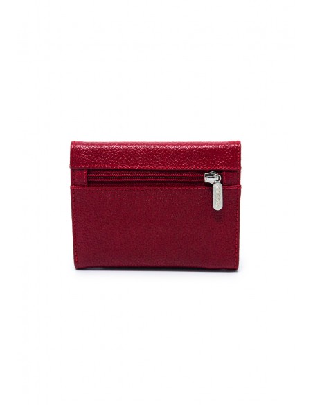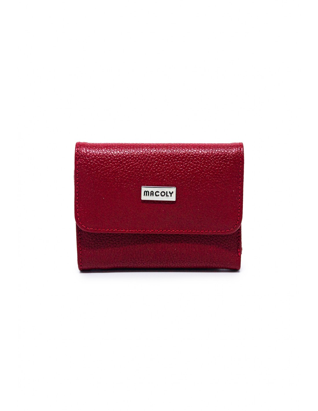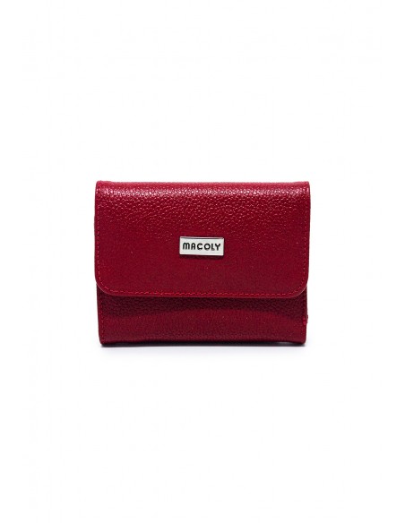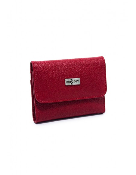 Billetera mini MACOLY. Esta elaborada en cuero, diseño casual con textura grabada, Detalles alusivos a la marca y finas costuras visibles. Tiene compartimientos internos para tarjetas y/o documentos, bolsillo posterior con cremallera y tapa con broche.