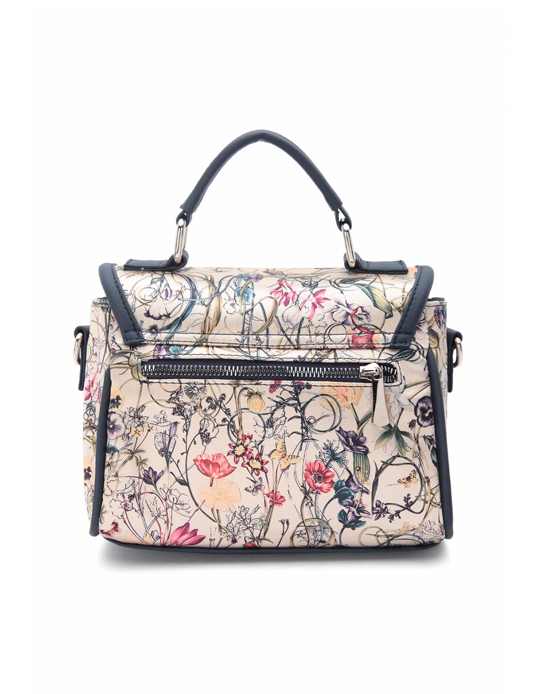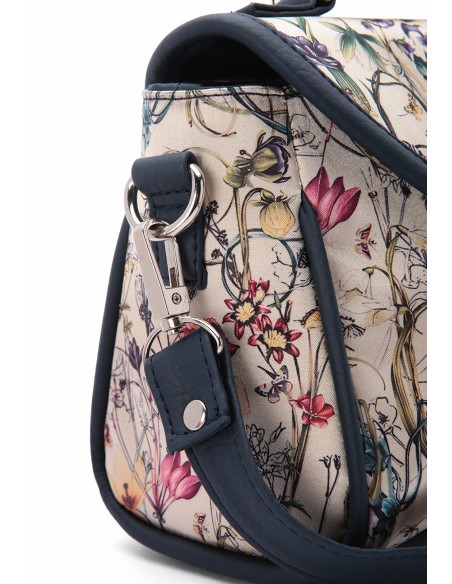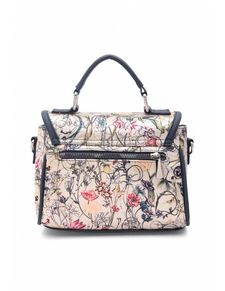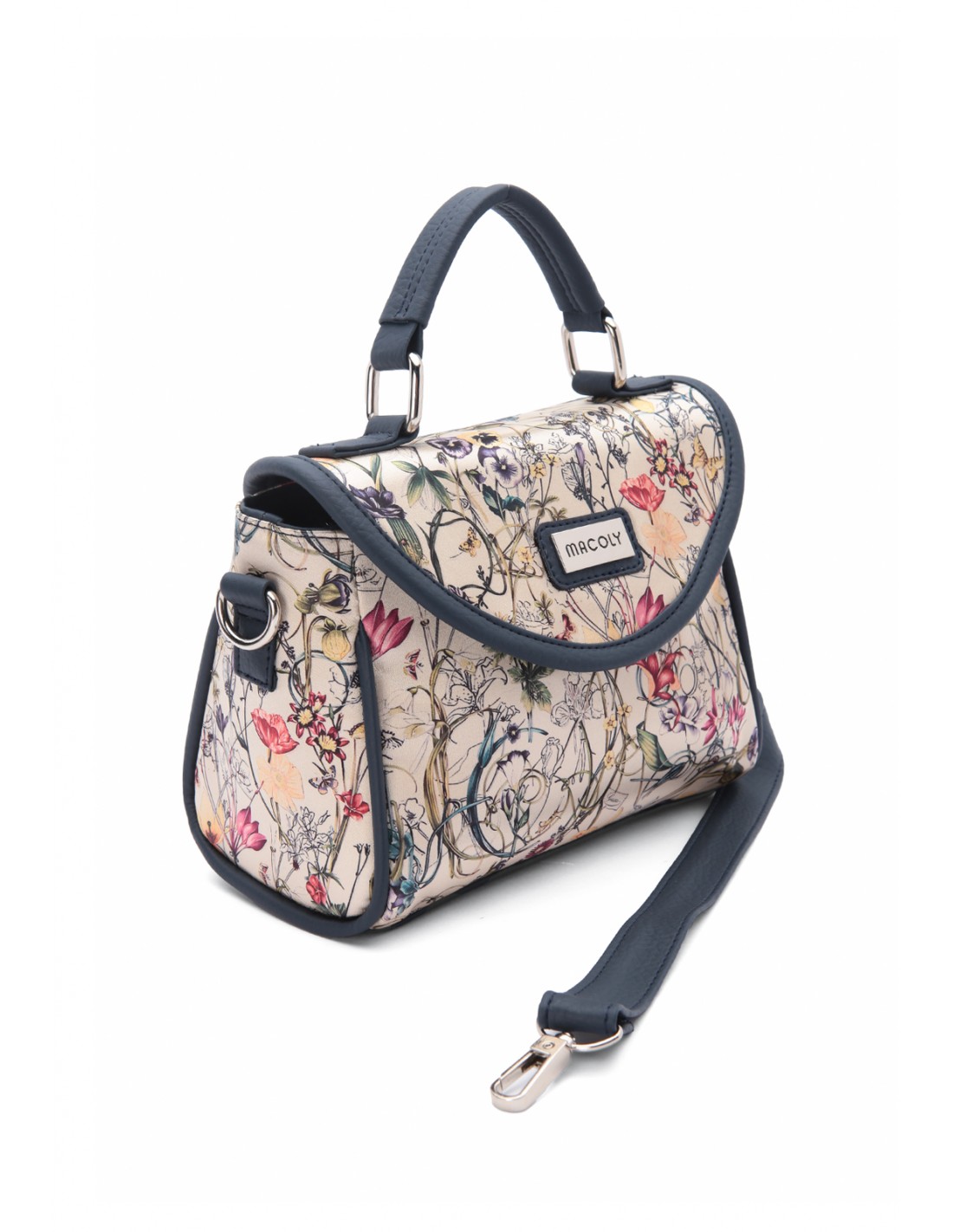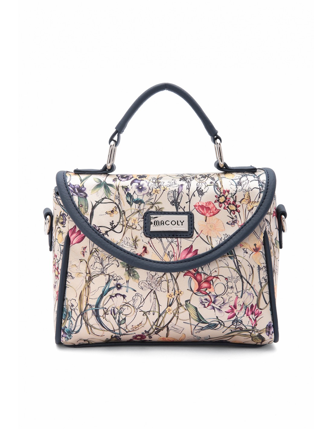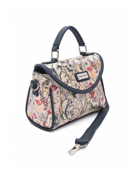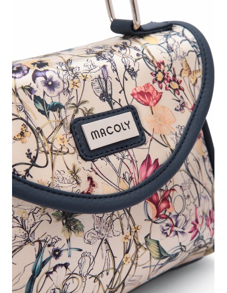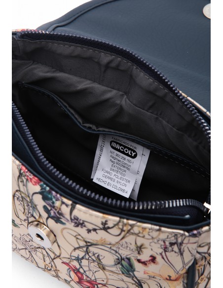 Cartera Manos Libres Macoly, elaborado en sintético PVC, diseño casual con textura con acolchado de rayas. Detalles alusivos a la marca y finas costuras visibles. Tiene un compartimiento con solapa interna y cremallera interna, tiene bolsillo posterior con cremallera, tapa con broche, manija, correa manos libres ajustable y charm naranja en forma de flor removible.
