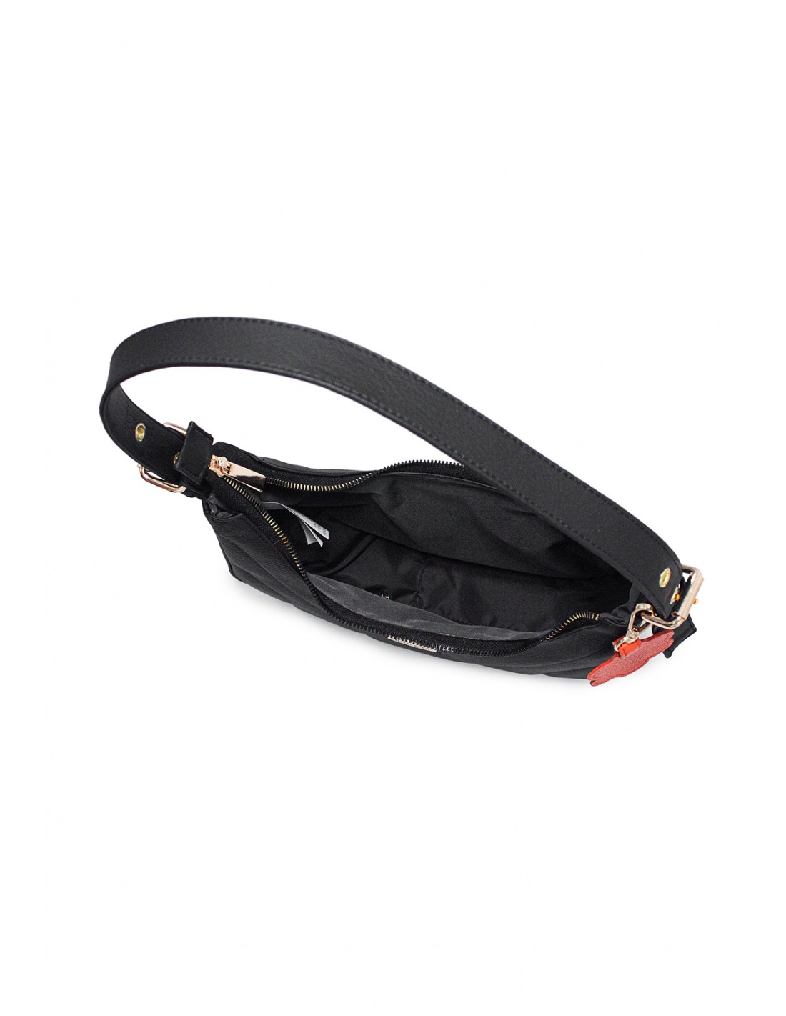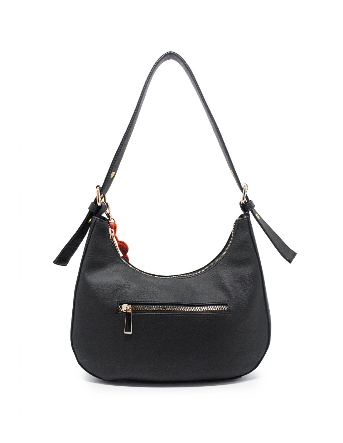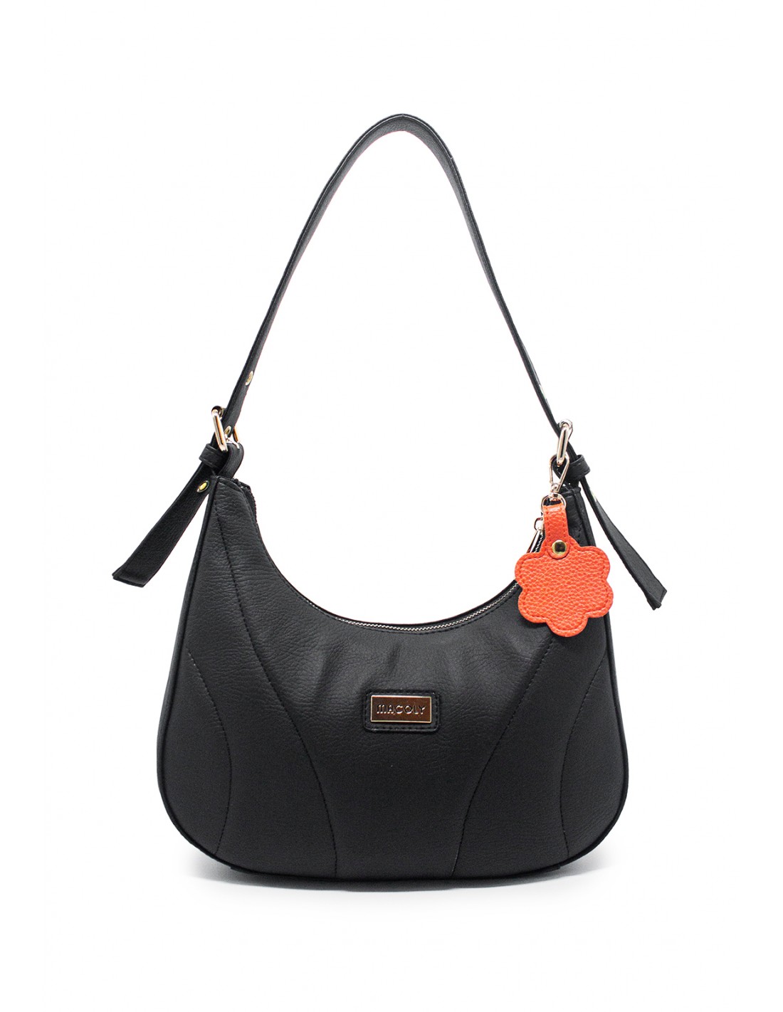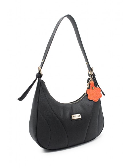 Bolso de hombro Macoly, elaborado en sintético PVC, diseño casual con textura con acolchado de rayas. Detalles alusivos a la marca y finas costuras visibles. Tiene un compartimiento amplio con cremallera interna, tiene bolsillo posterior con cremallera, manija de hombro y charm naranja en forma de flor removible.