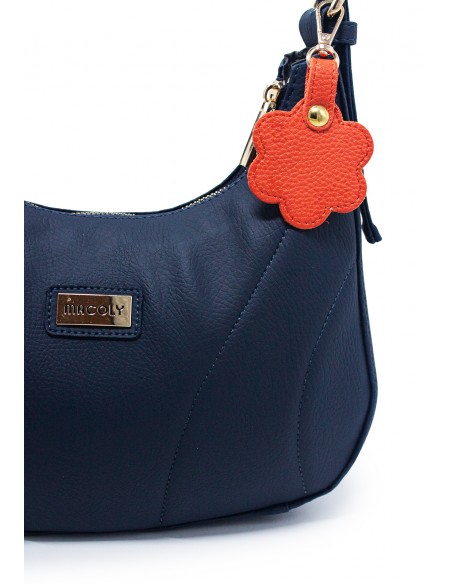 Bolso de hombro Macoly, elaborado en sintético PVC,  diseño casual con textura con acolchado de rayas. Detalles alusivos a la marca y finas costuras visibles. Tiene un compartimiento amplio con cremallera interna, tiene bolsillo posterior con cremallera, manija de hombro y charm naranja en forma de flor removible.
