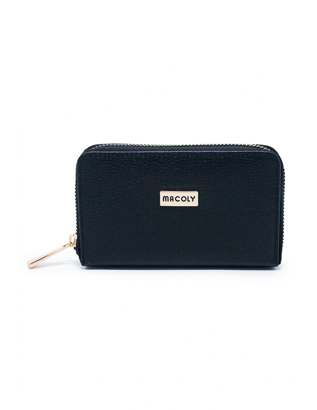 Billetera MACOLY. Elaborado en cuero vacuno, diseño casual con textura grabada. Detalles alusivos a la marca y finas costuras visibles. Tiene un compartimiento con cremallera con espacios internos para tarjetas y/o documentos y monedero interno.