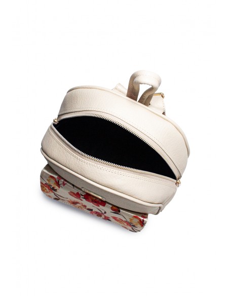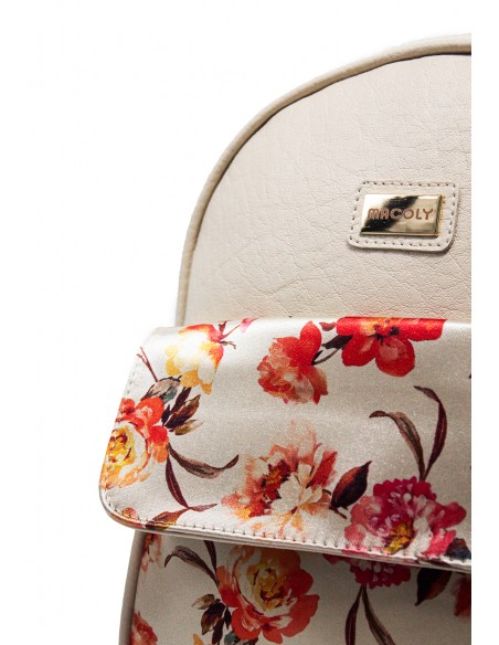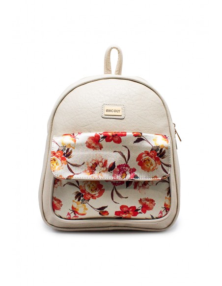 Morral mediano MACOLY, elaborado en sintético PVC, diseño casual con textura grabada. Detalles alusivos a la marca y finas costuras visibles. Tiene un compartimiento, bolsillo frontal con solapa, organizadores, cierre de cremallera y cargaderas de morral ajustables.