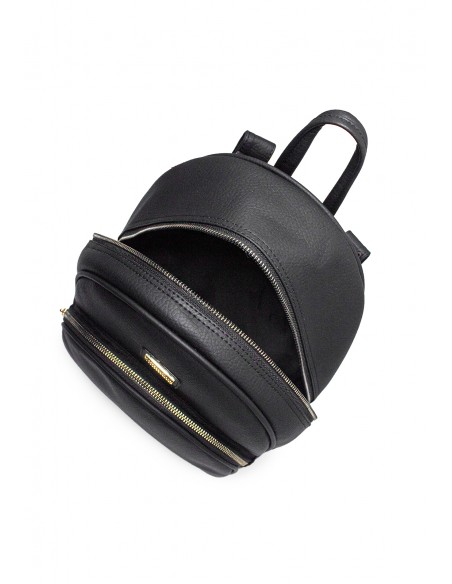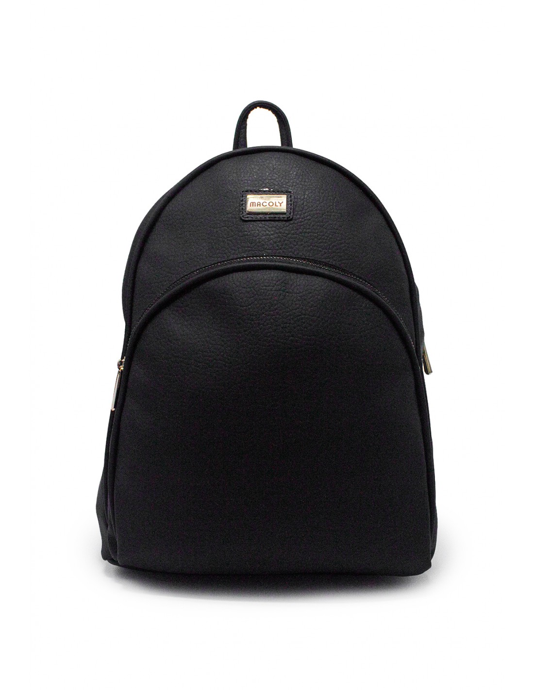 Morral mediano negro MACOLY, elaborado en sintético (pvc), diseño casual con textura. Detalles alusivos a la marca y finas costuras visibles. Tiene compartimiento amplio, bolsillo frontal con cierre, organizadores, cierre de cremallera y cargaderas de morral ajustables.
