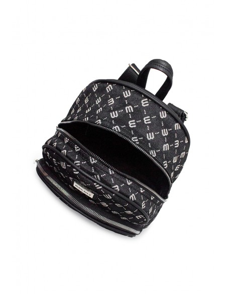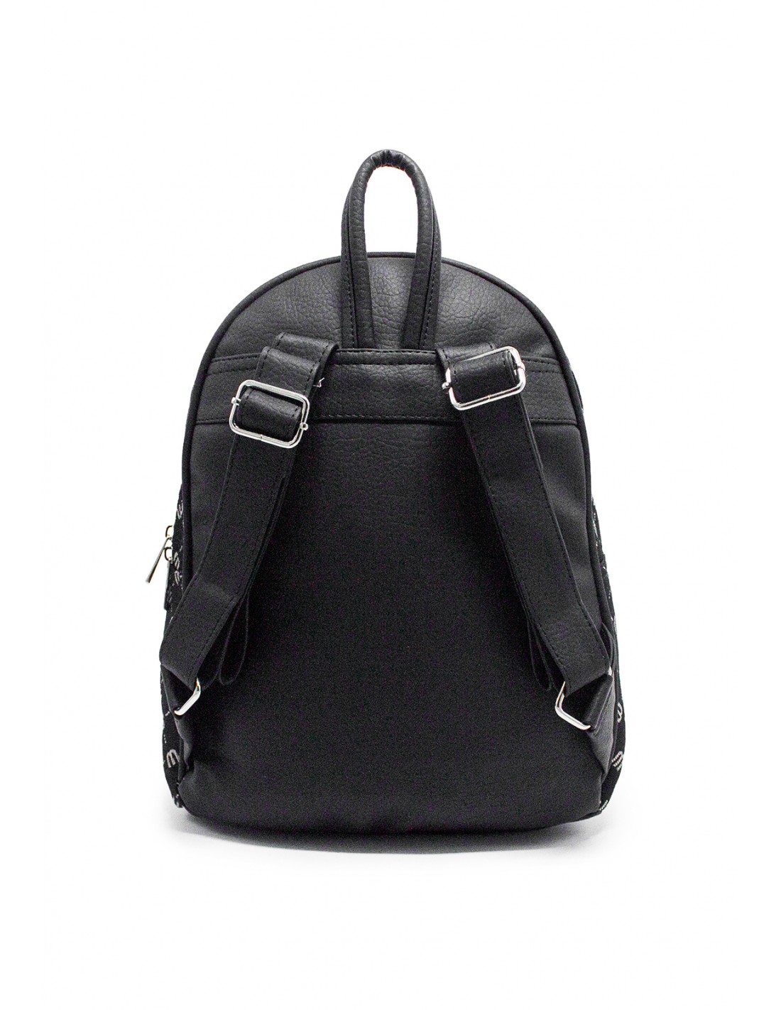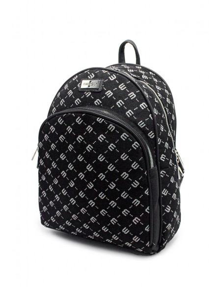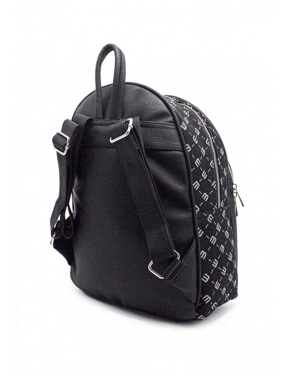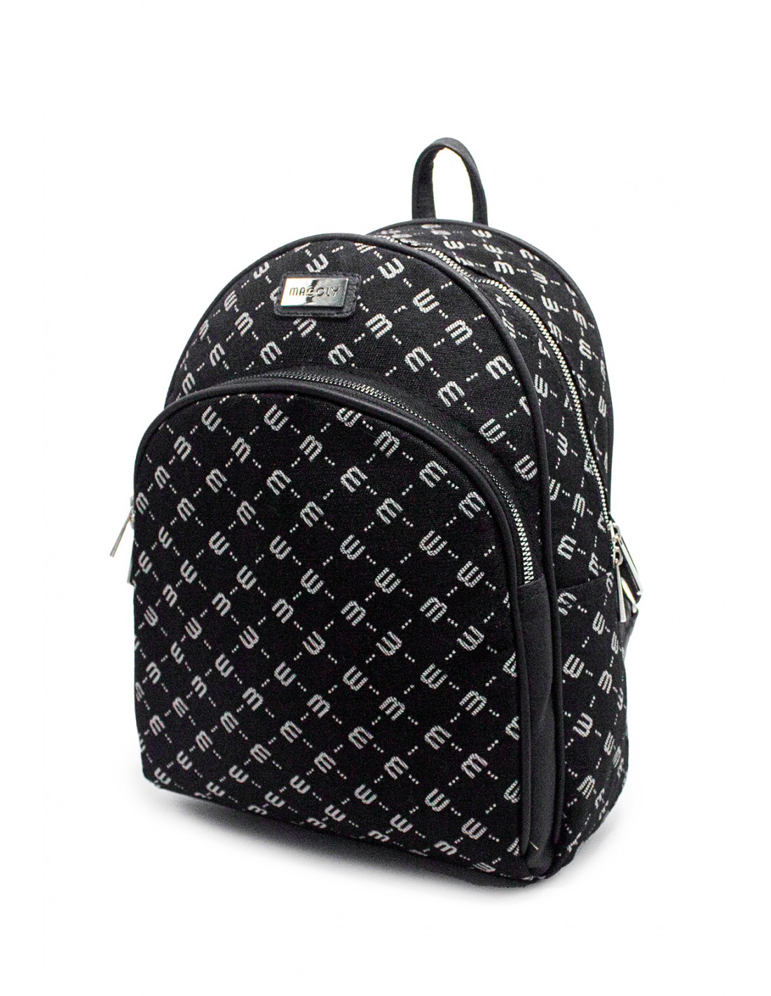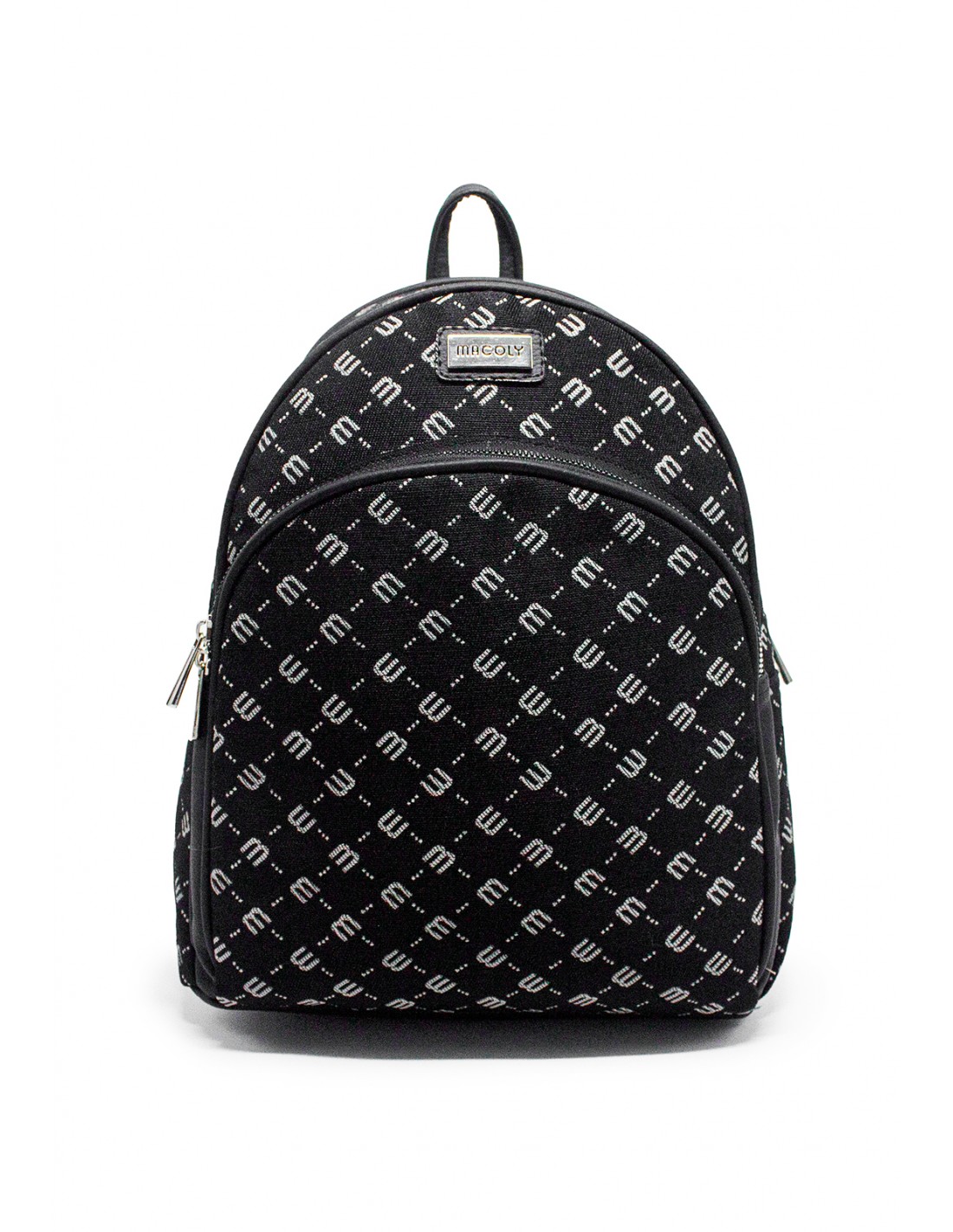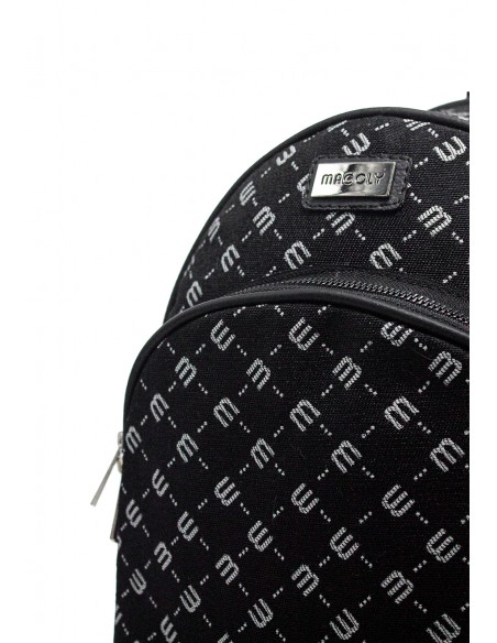 Morral mediano negro MACOLY, elaborado en sintético (pvc), diseño casual con textura. Detalles alusivos a la marca y finas costuras visibles. Tiene compartimiento amplio, bolsillo frontal con cierre, organizadores, cierre de cremallera y cargaderas de morral ajustables.