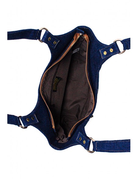 Bolso de hombro MACOLY, elaborado en jean, diseño casual con textura acolchada. Detalles alusivos a la marca y finas costuras visibles. Tiene compartimiento amplio con división, bolsillo interno con cremallera y solapa, tiene bolsillo posterior y frontal con cremallera y correas de hombro. Tiene herrajes en color dorado.