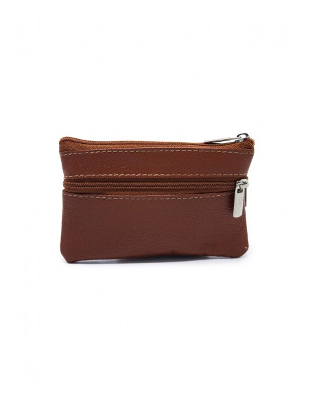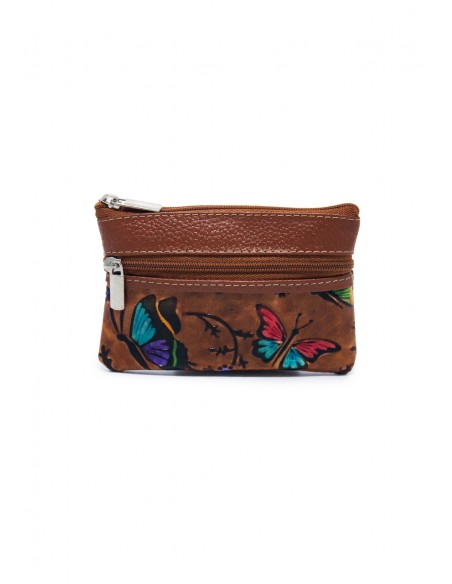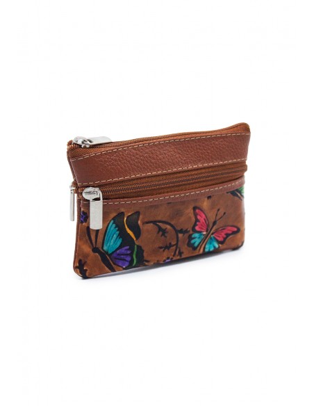 Monedero macoly elaborado en cuero con detalles pintados a mano, Tiene compartimiento con cremallera y bolsillo frontal y trasero con cremallera.