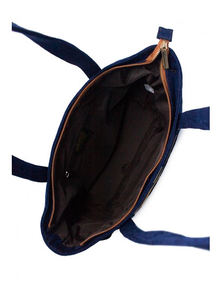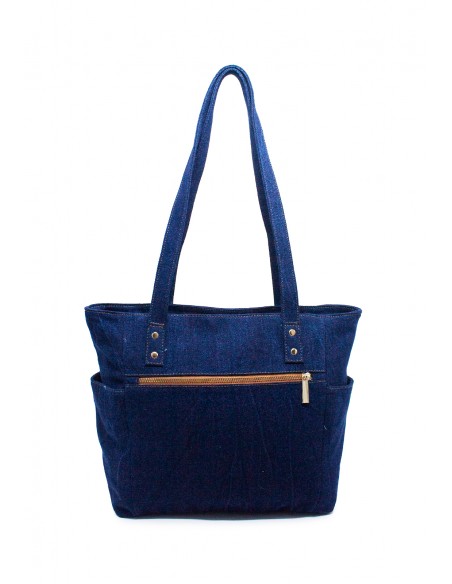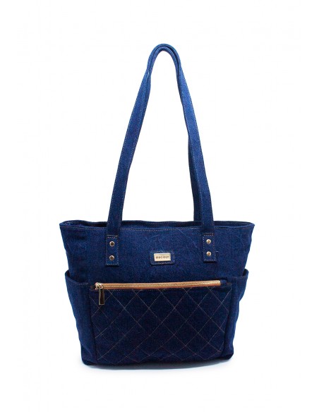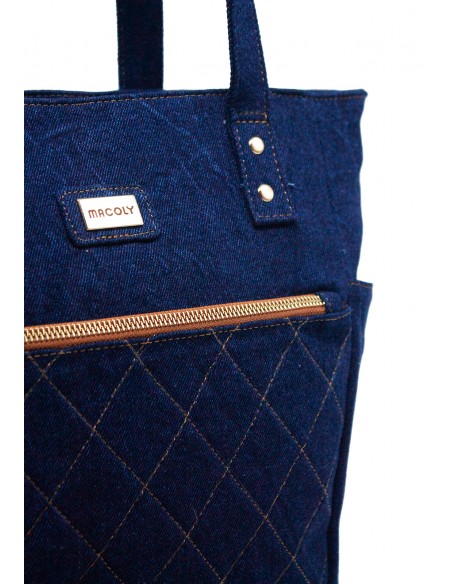 Bolso de hombro MACOLY, elaborado en jean, diseño casual con textura acolchada. Detalles alusivos a la marca y finas costuras visibles. Tiene compartimiento amplio con bolsillo interno con cremallera y solapa. Tiene bolsillo posterior y frontal con cremallera, Tiene bolsillos amplios laterales y correas de hombro. Tiene herrajes en color dorado.