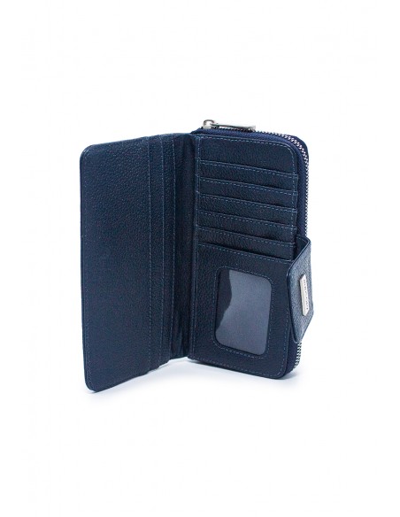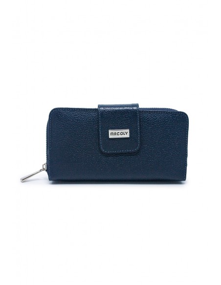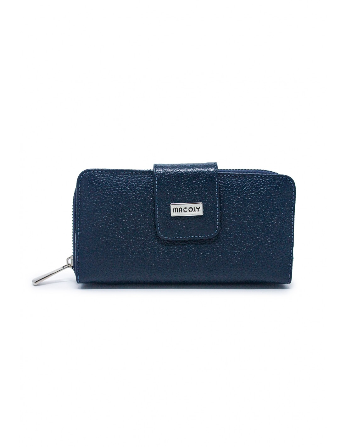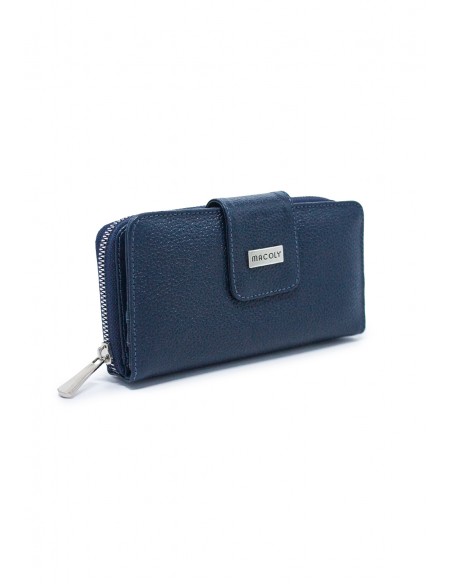 Billetera MACOLY. Elaborada en cuero, diseño casual con textura lisa. Detalles alusivos a la marca y finas costuras visibles. compartimientos internos para tarjetas y/o documentos, bolsillo monedero con cremallera y tapa con broche. Tiene herrajes en color plateado.