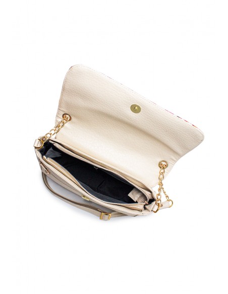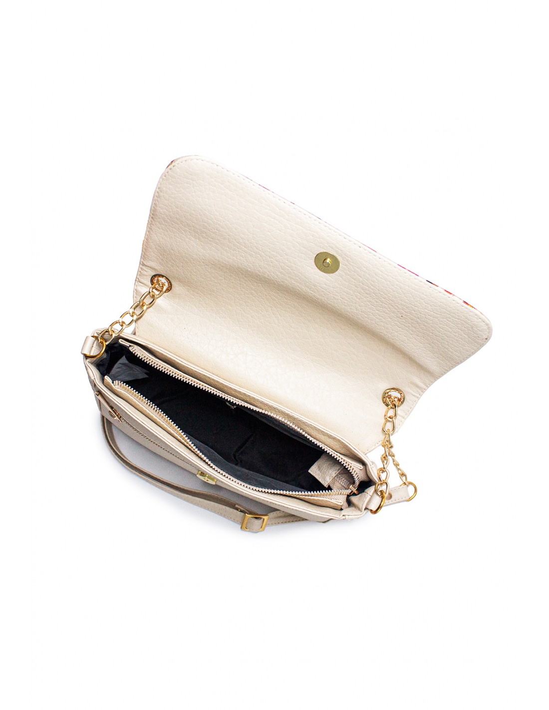 Cartera manos libres Macoly, Está elaborado en sintético (pvc), diseño casual con textura. Detalles alusivos a la marca y finas costuras visibles. Tiene un compartimiento con bolsillo interno con cremallera, en la parte frontal tiene un bolsillo con cremallera, Tiene tapa con broche, bolsillo posterior con cremallera y correa combinada con sintetico y cadena manos libres graduable.