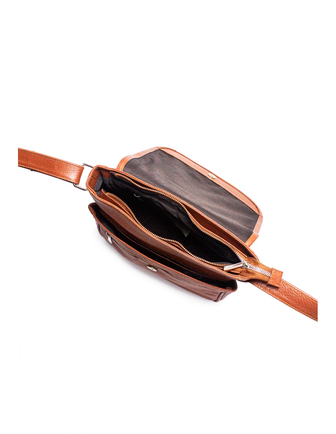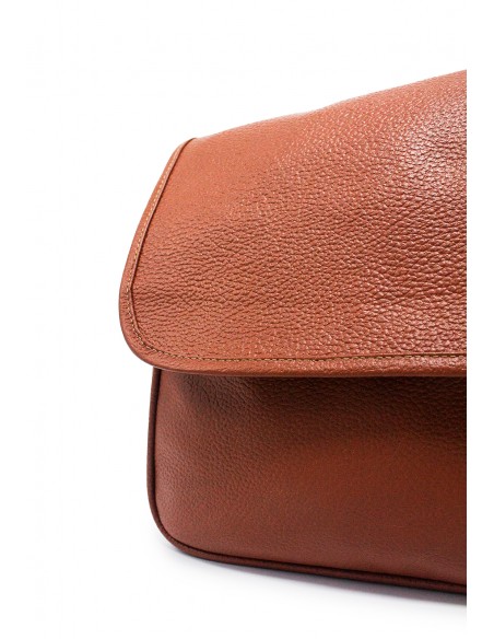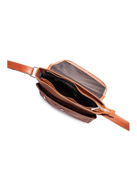 Bolso Manos Libres Macoly 037, Está elaborado 100% en cuero vacuno, diseño casual con textura lisa. Detalles alusivos a la marca y finas costuras visibles. Tiene un compartimiento amplio con cremallera interna, en el frente tiene una solapa amplia con compartimientos internos y cierre con cremallera, tiene tapa con broche, cierre posterior con cremallera y correa manos libres graduable.
