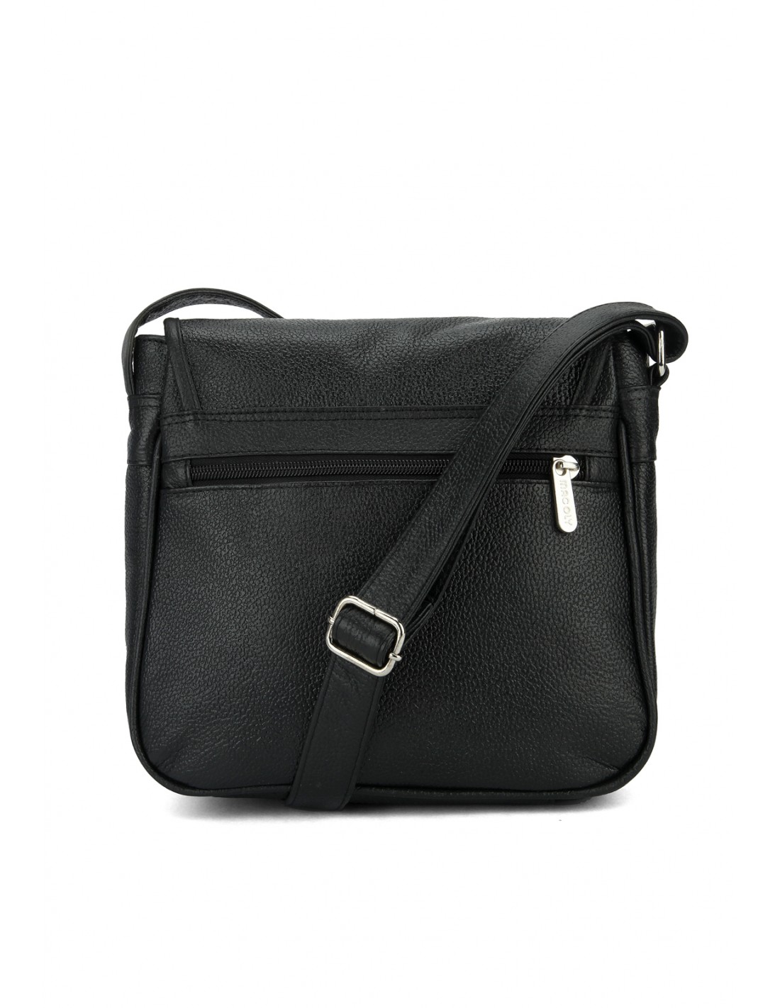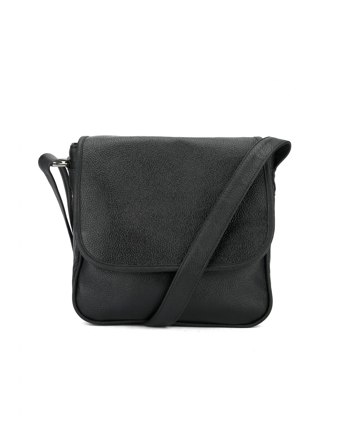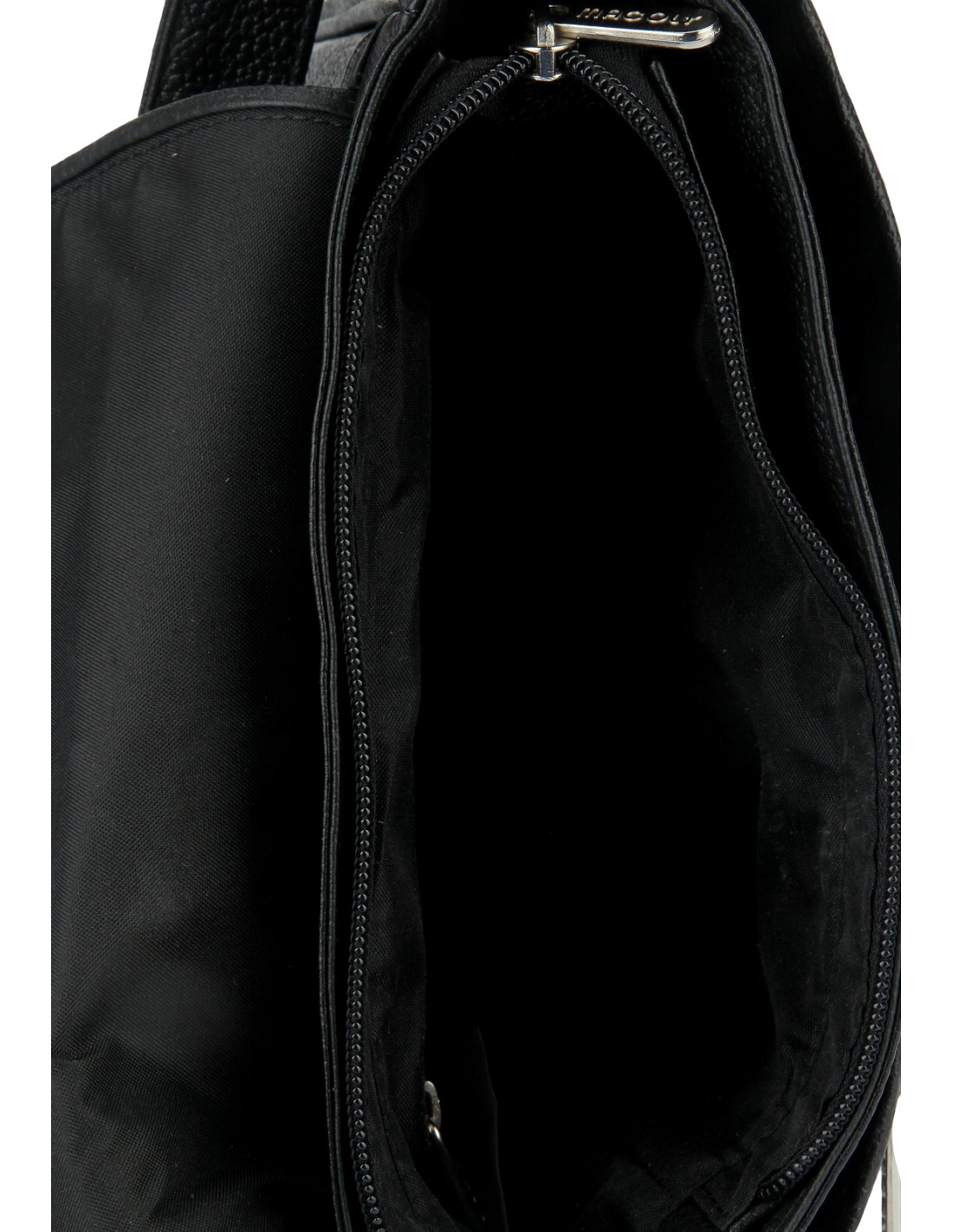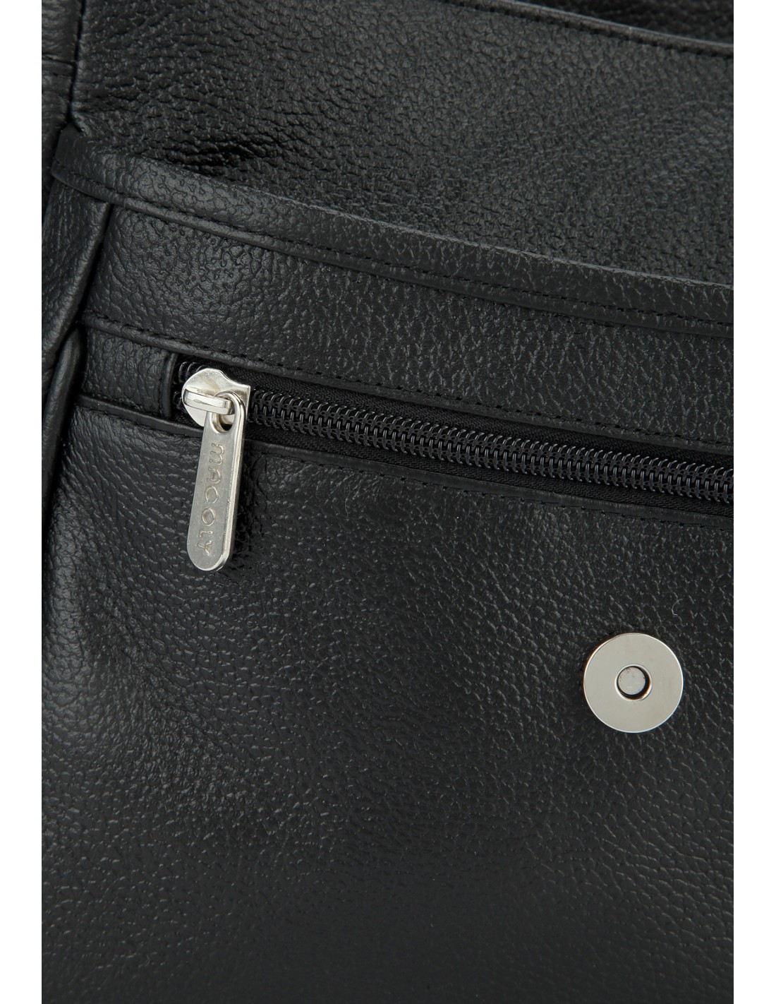 Bolso Manos Libres Macoly 037, Está elaborado 100% en cuero vacuno, diseño casual con textura lisa. Detalles alusivos a la marca y finas costuras visibles. Tiene un compartimiento amplio con cremallera interna, en el frente tiene una solapa amplia con compartimientos internos y cierre con cremallera, tiene tapa con broche, cierre posterior con cremallera y correa manos libres graduable.