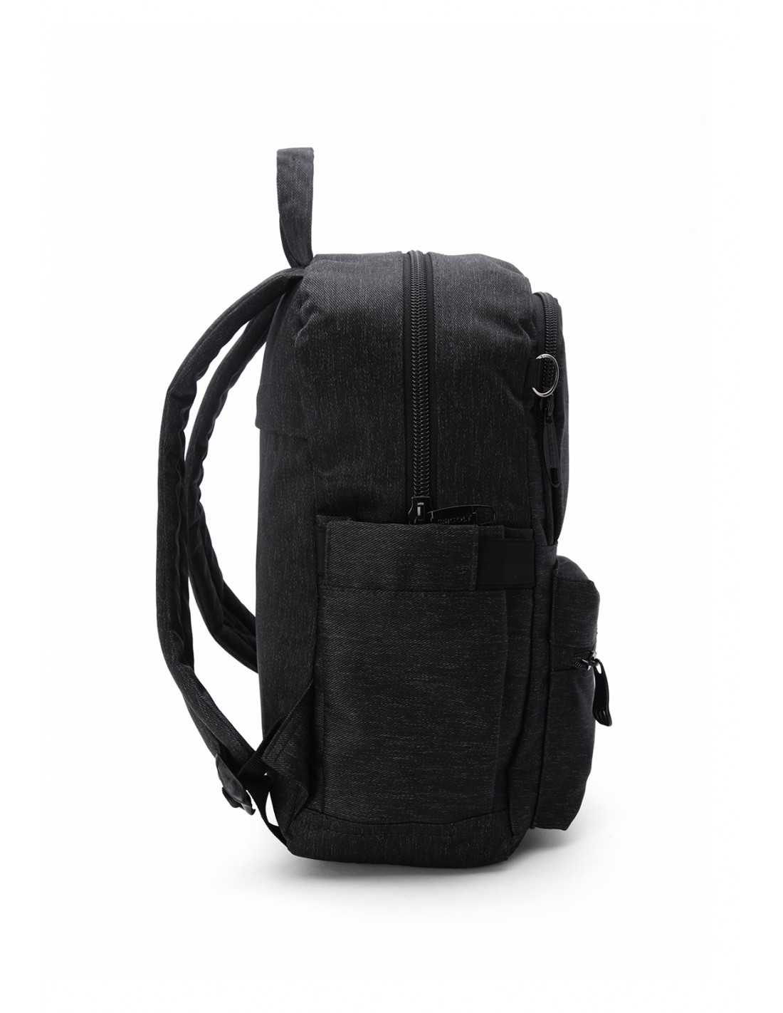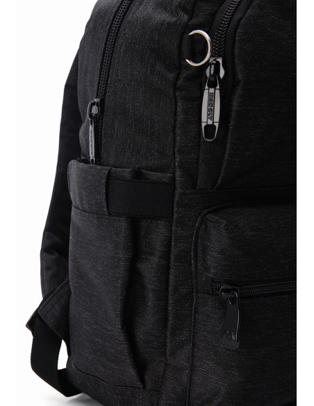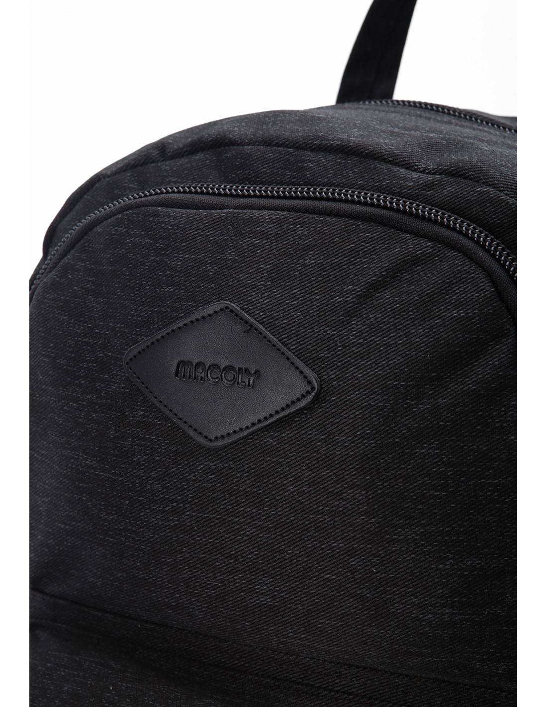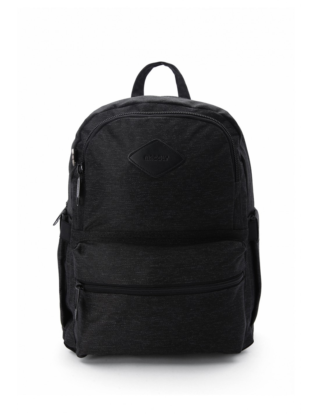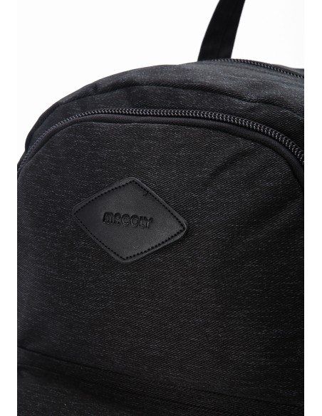 Morral MACOLY, elaborado en lona semi impermeable, diseño casual. Detalles alusivos a la marca y finas costuras visibles. Cuenta con un compartimento interno amplio, con bolsillo interno y solapa. En el frente cuenta con dos bolsillos frontales con cremallera. Tiene un bolsillo trasero con cremallera y bolsillos laterales en lona. Tiene espaldar acochado y cargaderas de morral ajustables y manija de mano.