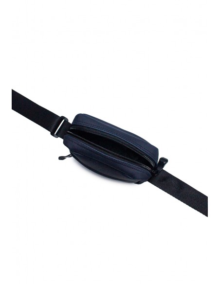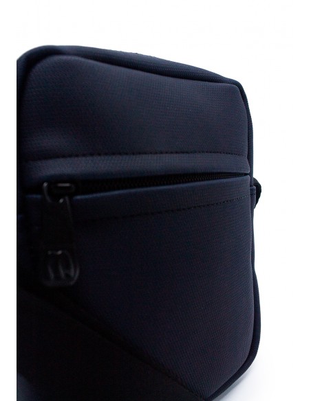 Bolso318 sintético MACOLY, Elaborado en lona semi impermeable, diseño casual. Detalles alusivos a la marca y finas costuras visibles. Es un Manos libres con compartimiento y solapa interna, tiene compartimiento frontal con cremallera, y correa manos libres graduable elaborada en lona.
