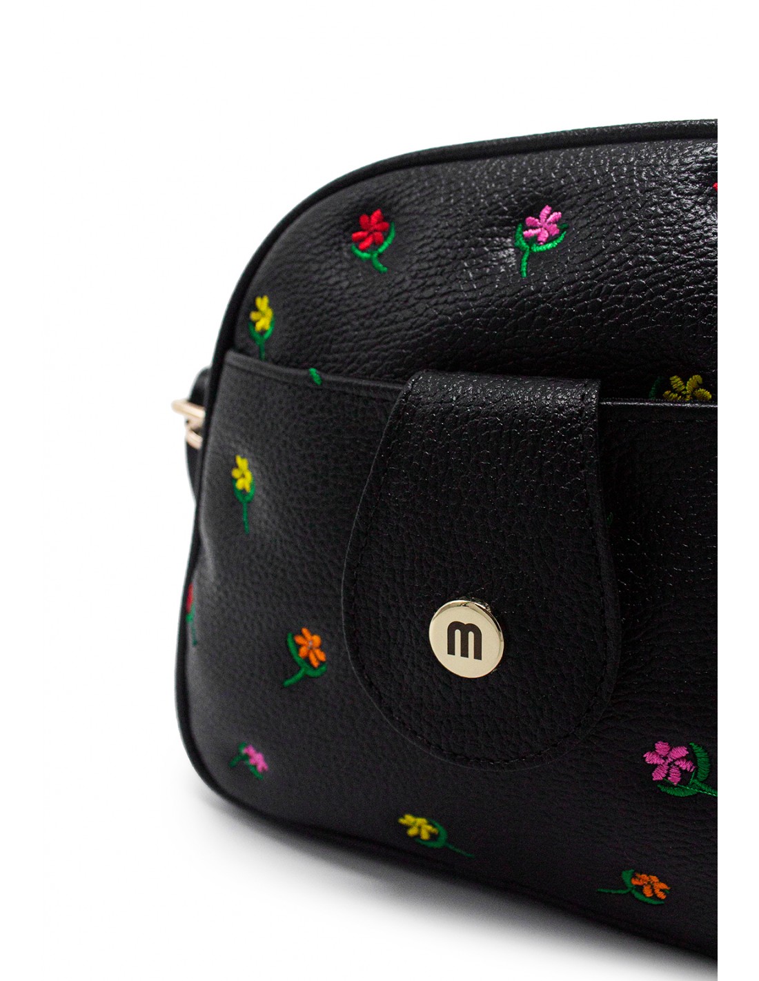 Bolso manos libres Macoly, está elaborado 100% en cuero vacuno, con textura bordada con flores de colores. Detalles alusivos a la marca y finas costuras visibles. Tiene compartimiento amplio con bolsillo interno con cremallera, tiene bolsillo posterior con cremallera, Tiene bolsillo frontal con tapa y cierre con broche, Tiene correa manos libres ajustable. Tiene herrajes en color dorado.