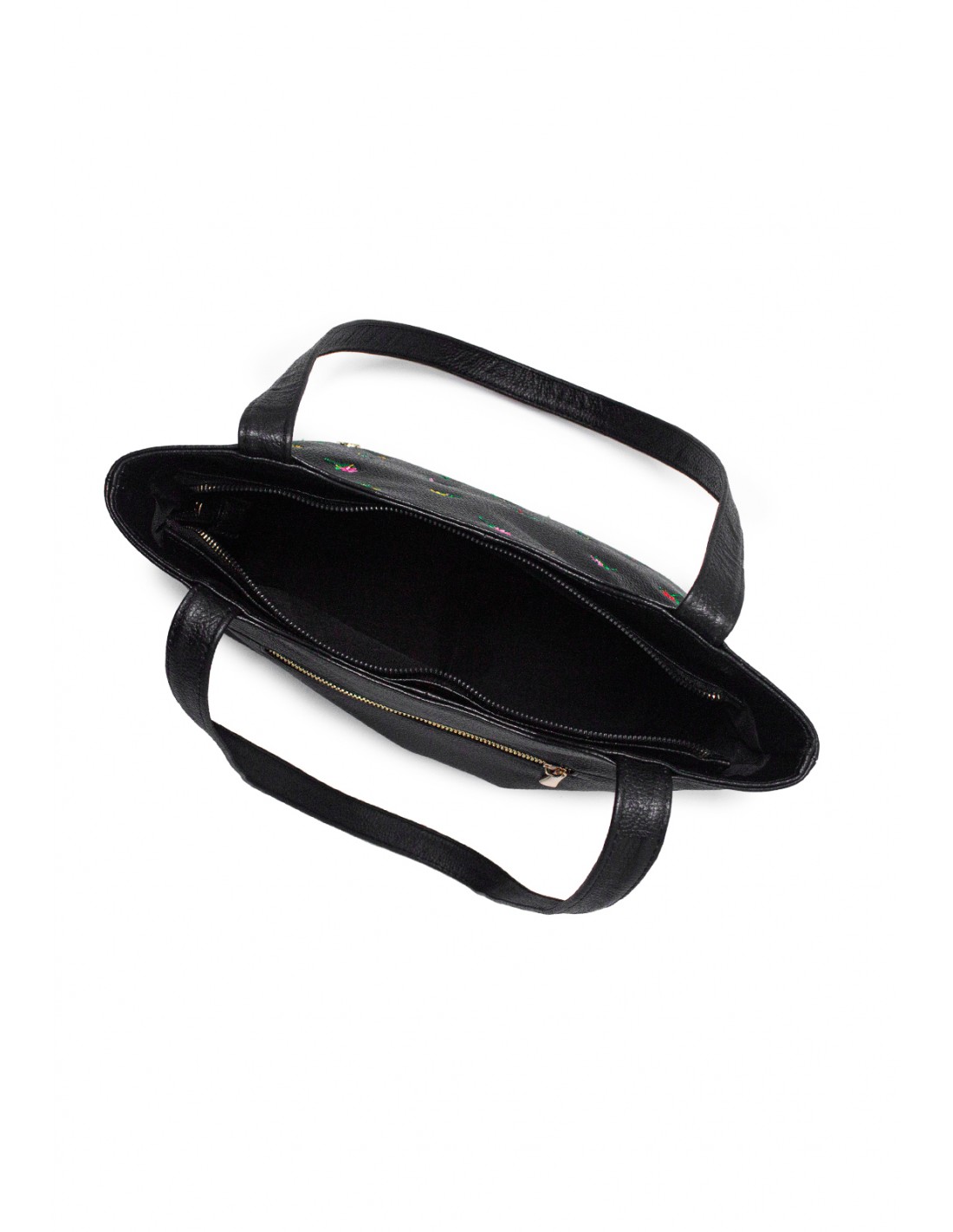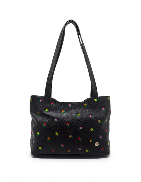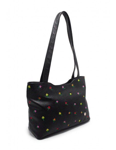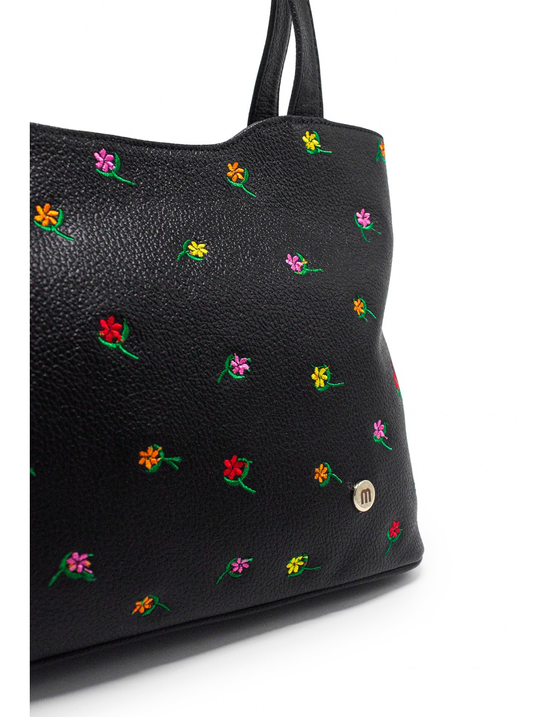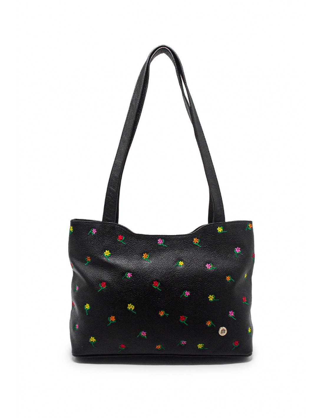 Bolso de hombro MACOLY, elaborado en cuero vacuno con textura bordada de flores de colores. Detalles alusivos a la marca y finas costuras visibles. Tiene compartimiento amplio, bolsillo posterior, organizadores, cierre de cremallera, bolsillo frontal con cremallera y manijas de hombro.
