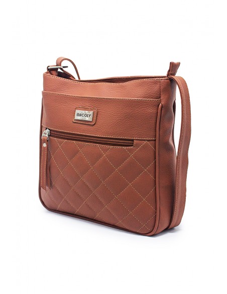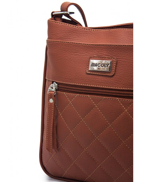 Bolso manos libres Macoly. Elaborado en lona PVC, diseño casual con textura grabada. Detalles alusivos a la marca y finas costuras visibles. Tiene compartimiento amplio con bolsillo con cremallera. Cuenta con bolsillo con broche y bolsillo frontal con cremallera y logo perforado de la marca. Tiene bolsillo posterior con cremallera. Cuenta con correa manos libres graduable.