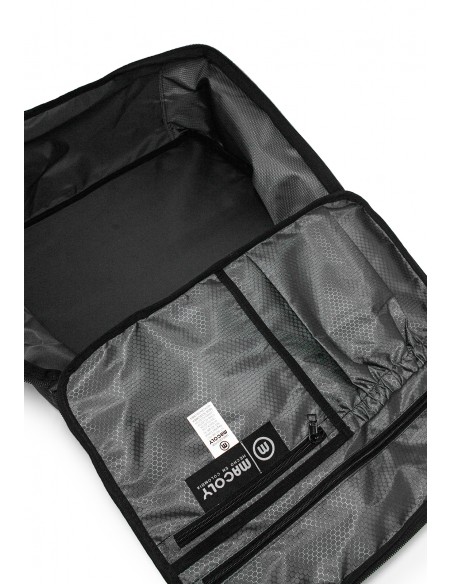 Morral 309 lona MACOLY, elaborado en lona semi impermeable, diseño casual. Detalles alusivos a la marca y finas costuras visibles. Morral con compartimiento amplio con bolsillo interno que tiene apertura completa tipo maleta de viaje, En el interior, sobre la tapa tiene bolsillo con cremallera, bolsillo con resorte y bolsillos auxiliares. En el frente tiene dos bolsillos, cuenta con espaldar acolchado y tiene pasador para manijas de maleta de ruedas, tiene 2 bolsillos laterales en lona, manija y cargaderas acolchadas ajustables. Es apto para usar como artículo personal de aerolínea, sin embargo, te recomendamos comparar las medidas con cada aerolinea ya que algunas manejan diferentes medidas.